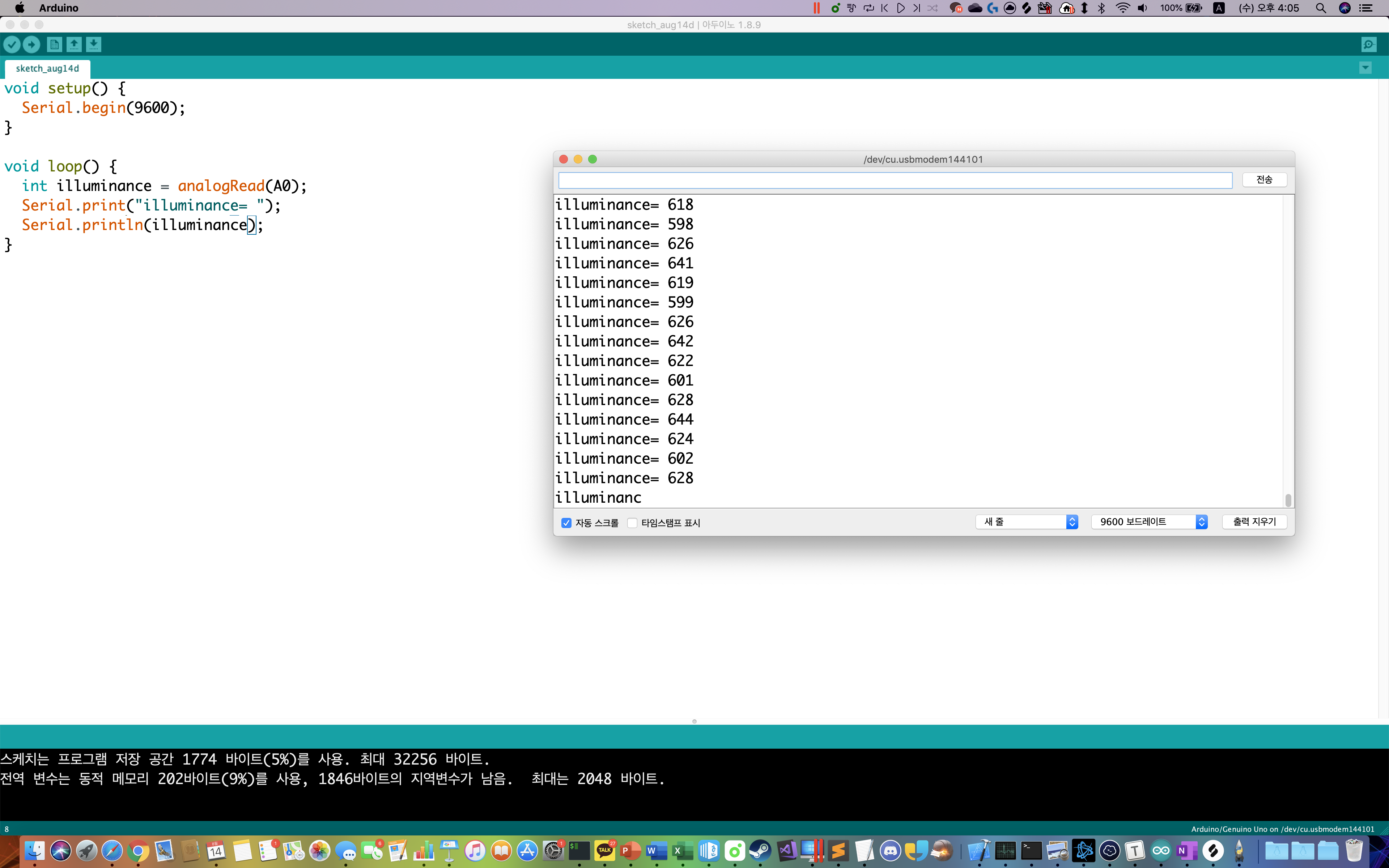 조도 값이 손을 가져다 댔을때 와 땠을때 바뀌는 것을 확인 할 수 있다.